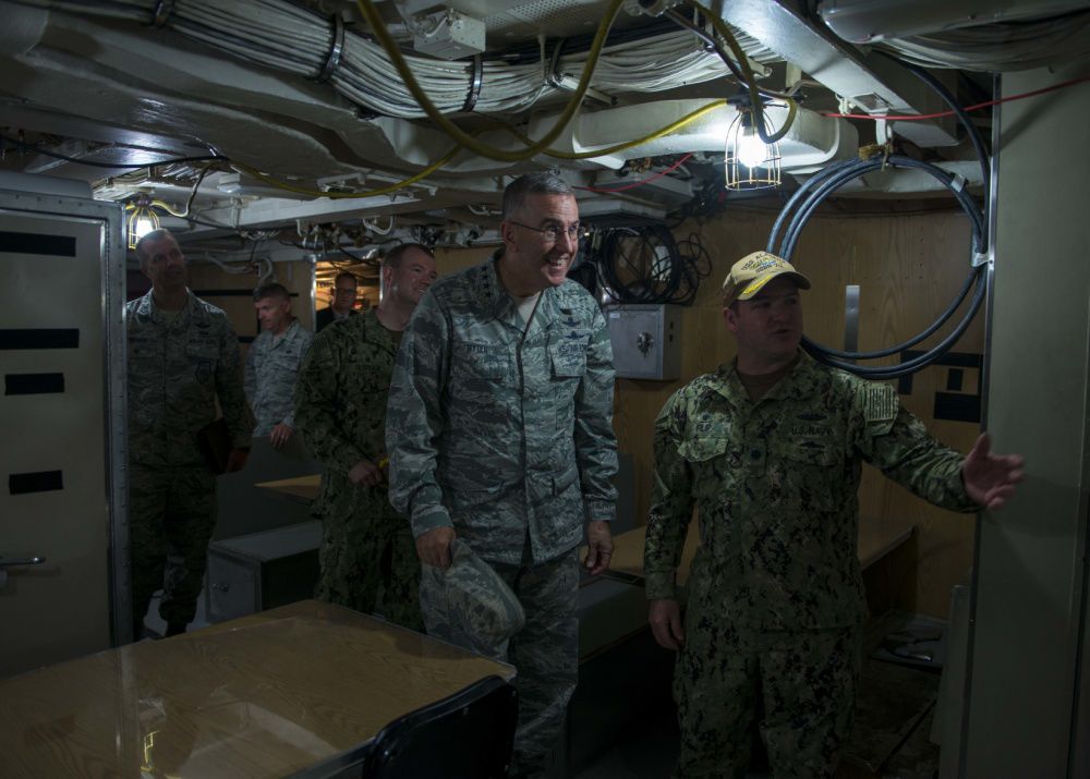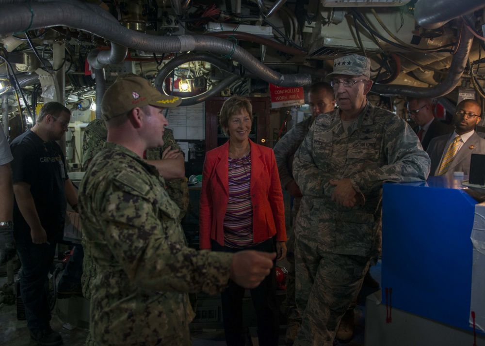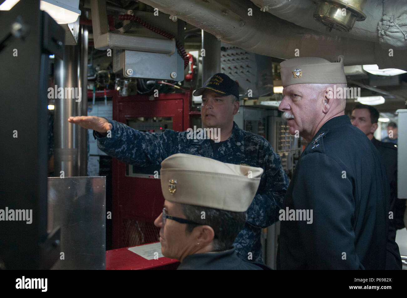 A Crewman Connects A Sound Powered Phone Through A Deck Outlet As