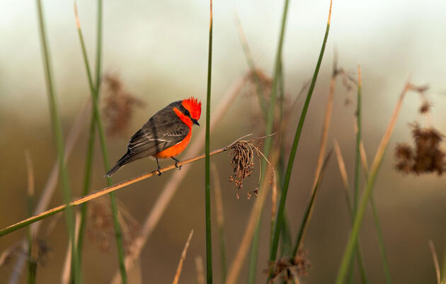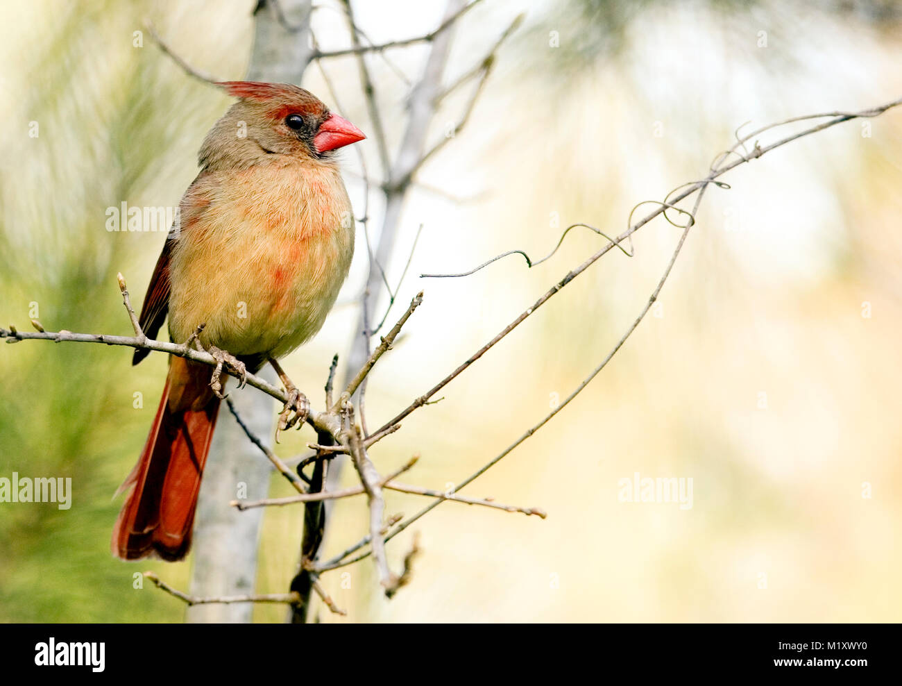 An Adult Male Northern Cardinal Perched On A Pine Branch Early Stock Photo Alamy